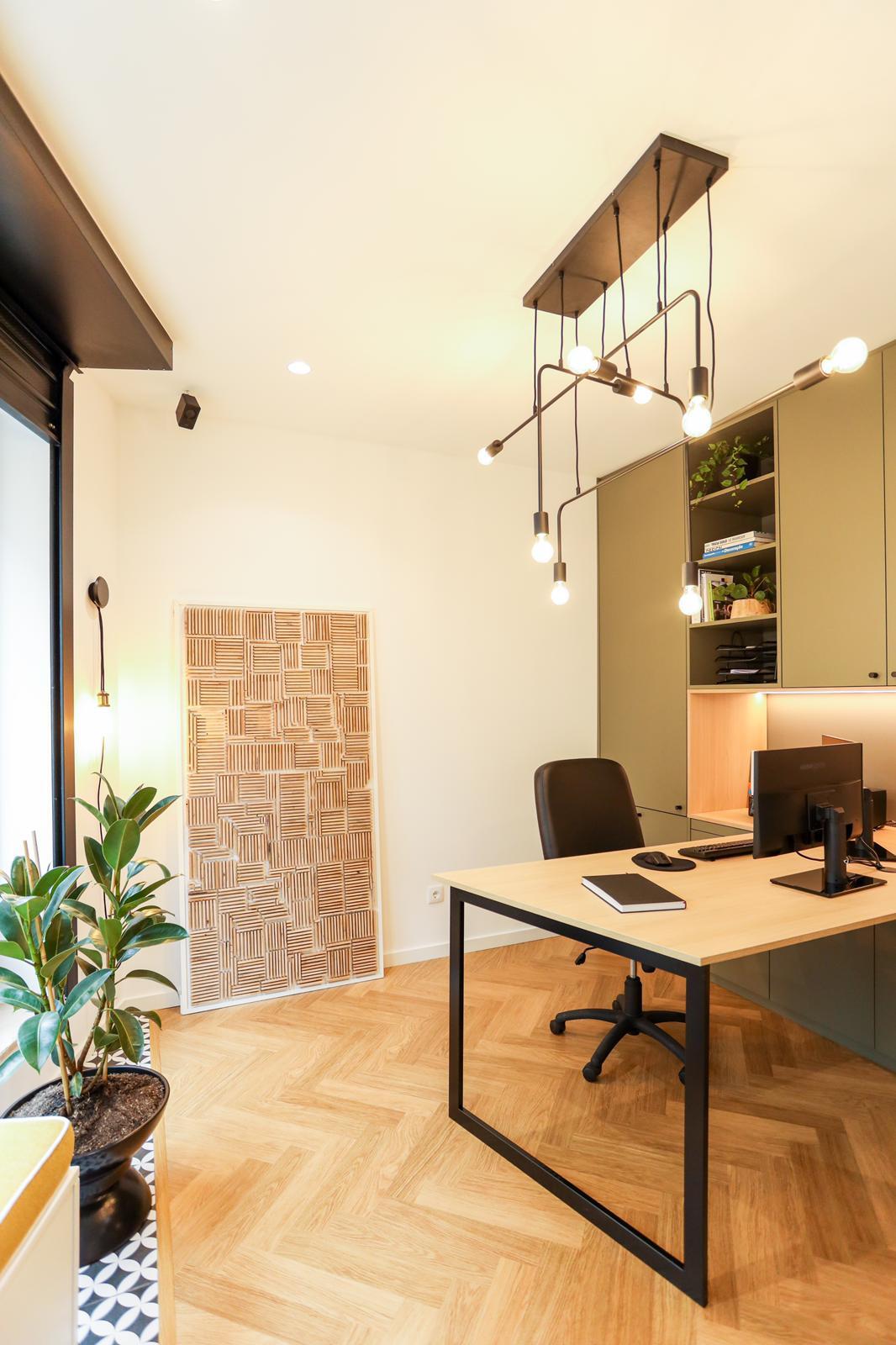 O resultado é um escritório contemporâneo e funcional, com uma atmosfera luminosa e acolhedora, que utiliza uma paleta de cores neutras, mobiliário personalizado (como os armários em verde-oliva) e uma iluminação estratégica. O objetivo de transformar um espaço cru num ambiente de trabalho profissional e inspirador foi totalmente alcançado, entregando o espaço pronto a ser utilizado.