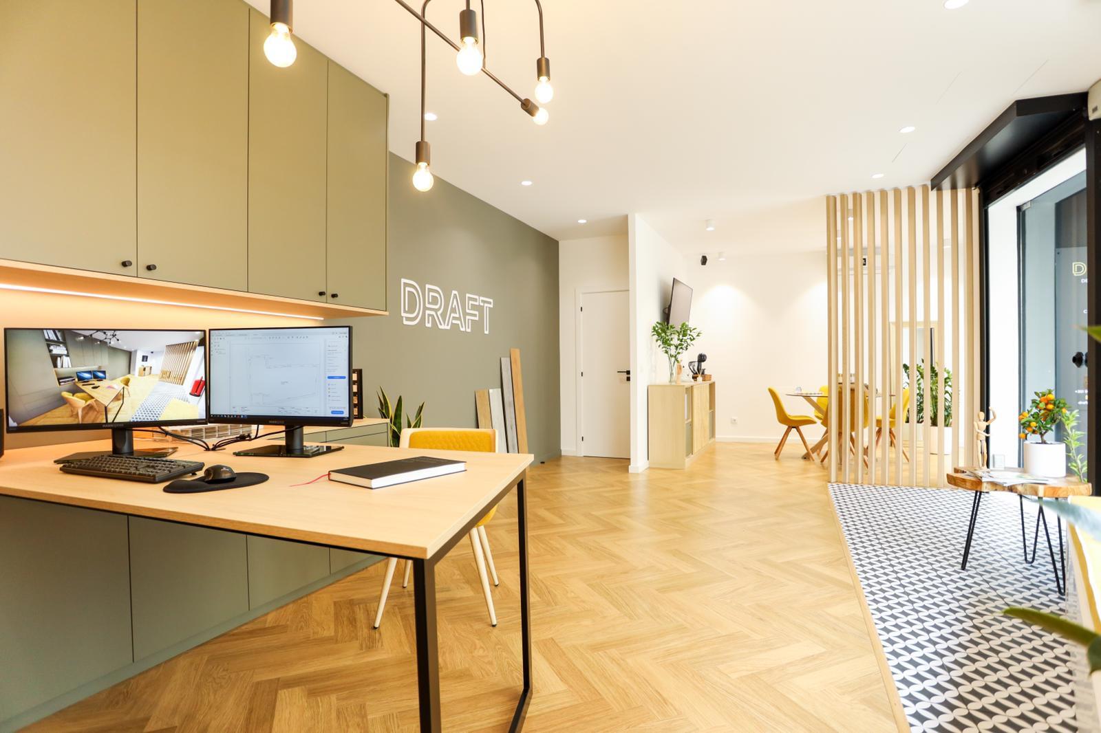 Neste projeto de design de interiores consistiu numa solução chave na mão para a criação de um espaço de trabalho moderno e funcional. A intervenção abrangeu a remodelação total do espaço, desde a fase inicial de construção visível na imagem “antes” até ao resultado final apresentado.