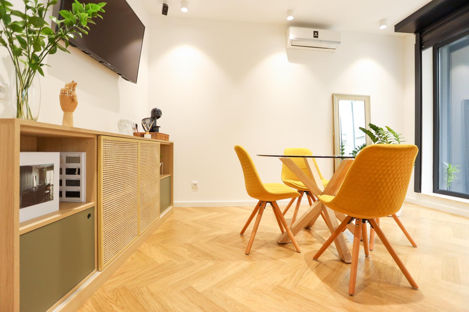 A abordagem “chave na mão” implicou a gestão de todas as fases do projeto: conceção do layout e design (escolha de materiais, cores e mobiliário), coordenação de todas as obras (instalação do novo pavimento em espinha de madeira, pintura, eletricidade, etc.) e a montagem final de todo o equipamento e decoração.